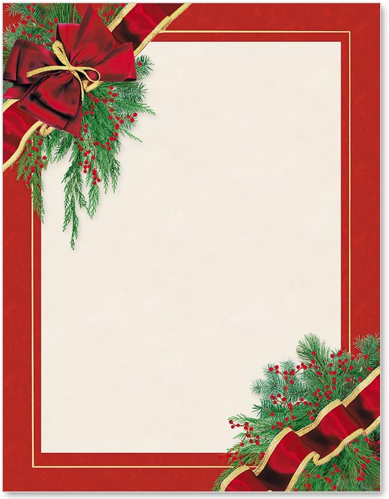 WHY THEY ARE UNIQUE: Trimmed in Gold Foil Border Papers come with gold foil accents for an extra-fancy touch BASIC DETAILS: The complete set includes (100) 8 1/2″ x 11″ Border Papers made from durable 28lb stock PRINTING OPTIONS: These stationery papers are laser and inkjet printer compatible, so you can customize them yourself DESIGN DETAILS: Each off-white stationery paper features a red and gold border, pine boughs, and red ribbon designs with gold foil accents on one side MULTIPLE USES: Use your custom Trimmed in Gold Foil Border Papers for workplace holiday parties and potlucks, award banquets, Christmas fundraisers, seasonal concerts, stage productions, tree trimming parties, newsletters, invites, and more